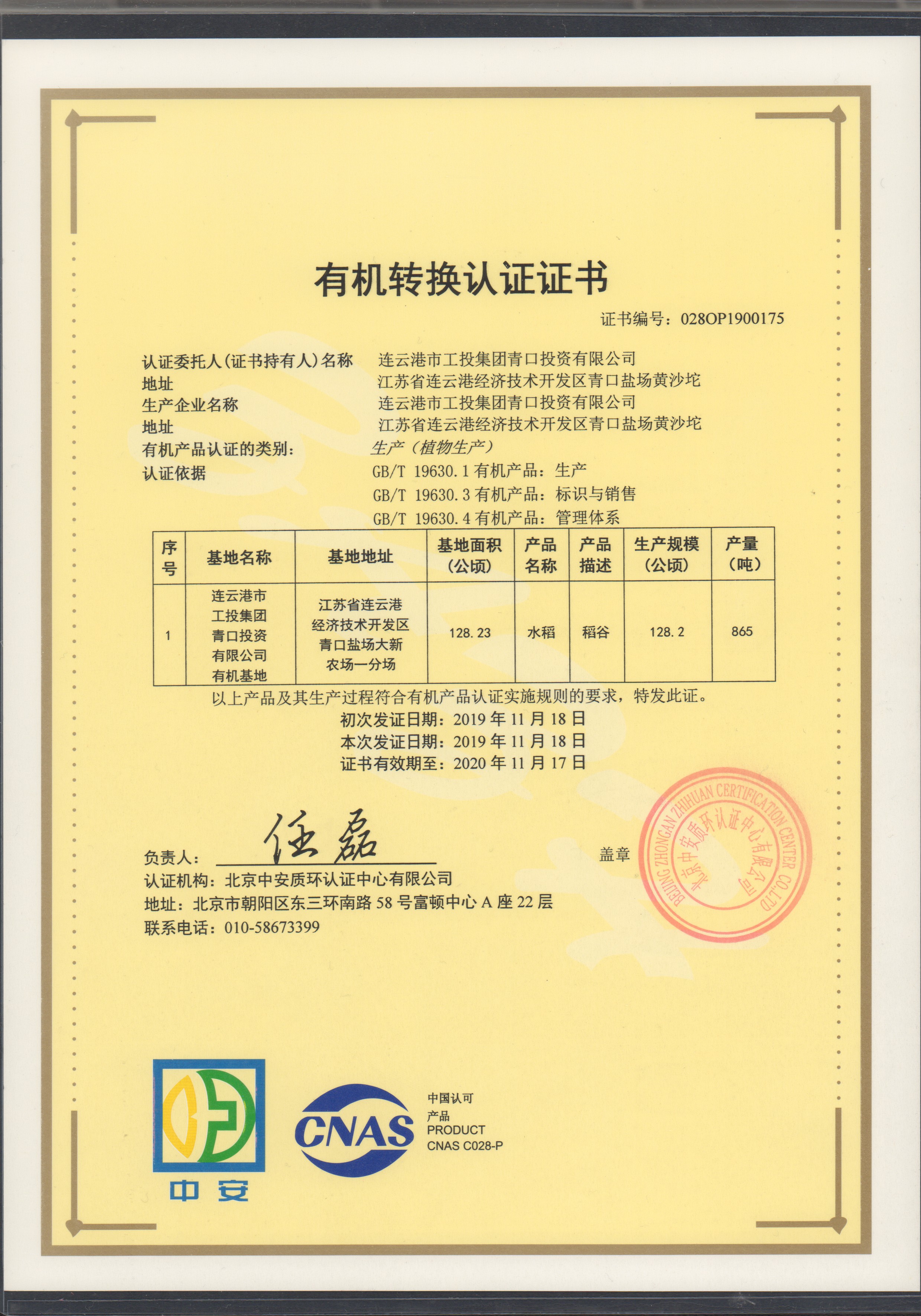 11月25日上午,青口投資公司種植的“南粳9108”有機(jī)大米經(jīng)過嚴(yán)格的檢測(cè)和審核,榮獲北京中安質(zhì)環(huán)認(rèn)證中心頒發(fā)的有機(jī)轉(zhuǎn)換認(rèn)證證書。