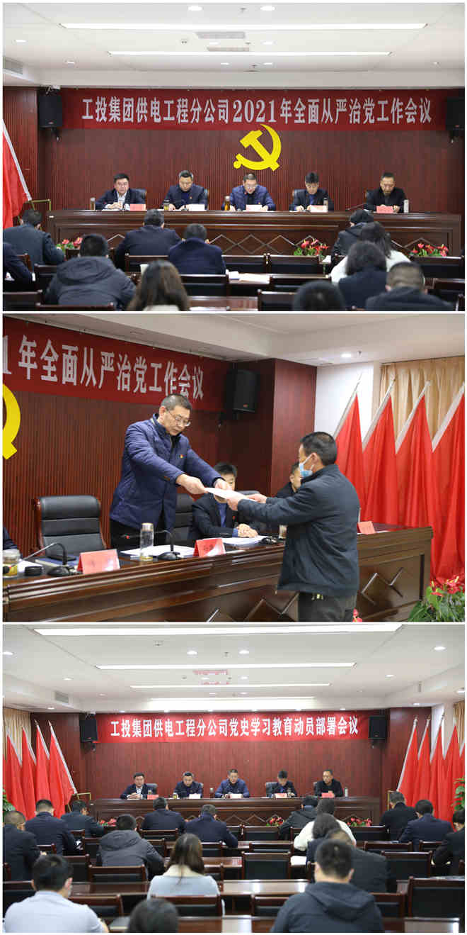 上半場,在公司2021年全面從嚴(yán)治黨工作會議上,全體參會人員首先觀看了全面從嚴(yán)治黨工作警示教育片。隨后,黨委書記、經(jīng)理孫政權(quán)在題為《強化政治建設(shè) 聚焦深度融合 以大黨建引領(lǐng)公司高質(zhì)量發(fā)展新征程》的黨委工作報告中指出,過去的一年,面對新冠疫情和經(jīng)濟下行的雙重壓力,公司黨委深入學(xué)習(xí)貫徹習(xí)近平新時代中國特色社會主義思想,以“不忘初心、牢記使命”主題教育為主線,扎實開展“雙融雙創(chuàng)”黨內(nèi)主題教育實踐活動,壓實管黨治黨責(zé)任、勇于直面困難挑戰(zhàn),推動公司經(jīng)濟在逆境中取得突破,黨建工作取得了顯著成效。報告強調(diào),2021年黨委工作的指導(dǎo)思想是:深入學(xué)習(xí)貫徹習(xí)近平新時代中國特色社會主義思想、十九屆五中全會精神等內(nèi)容,以“全面從嚴(yán)治黨”為統(tǒng)領(lǐng),以“黨史學(xué)習(xí)教育”為主線,以打造“工電先鋒”黨建品牌為抓手,扎實開展“奮進新時代、領(lǐng)航開新篇”黨內(nèi)主題教育活動,以“大黨建”整合力量、凝聚人心,發(fā)揮黨的關(guān)鍵引領(lǐng)作用,將黨的政治優(yōu)勢轉(zhuǎn)化為發(fā)展優(yōu)勢。團結(jié)帶領(lǐng)廣大干部員工,統(tǒng)一思想、凝聚力量,勇于擔(dān)當(dāng)、開拓進取,加大改革創(chuàng)新、轉(zhuǎn)型升級、管理提升推動力度,開創(chuàng)工投供電高質(zhì)量發(fā)展新局面,以改革發(fā)展優(yōu)異成績向建黨100周年獻禮,為扛起“爭當(dāng)表率、爭做示范、走在前列”重大使命、奪取“十四五”發(fā)展開局首勝作出貢獻。圍繞上述總體要求,重點做好五個方面工作:持續(xù)深化政治建設(shè),推進黨建經(jīng)濟深度融合;持續(xù)強化基層基礎(chǔ),構(gòu)建企業(yè)大黨建格局;持續(xù)推進人才隊伍建設(shè),增強高質(zhì)量發(fā)展推動力;持續(xù)推進黨風(fēng)廉政建設(shè),推進全面從嚴(yán)治黨向縱深發(fā)展;持續(xù)推進和諧企業(yè)創(chuàng)建,維護和諧穩(wěn)定發(fā)展的良好局面。
