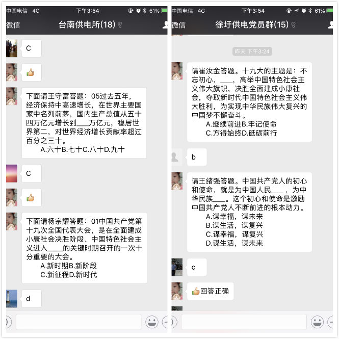 本次考試采用微信答題的方式,由黨群人員先在微信群里清點黨員人數(shù),隨后每人回答指定問題,確保測試范圍覆蓋全體黨員。微信考試的方式,解決了黨員學(xué)習(xí)時間上、空間上的難題,具有很大的便利性和可操作性。(電宣)