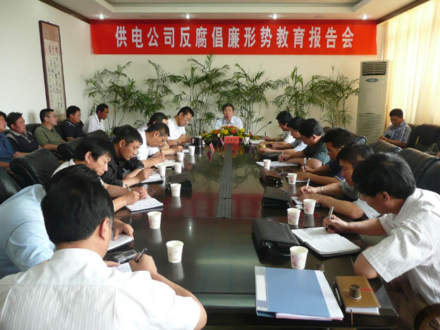 近日,我公司邀請(qǐng)了市紀(jì)委常委、市紀(jì)委秘書長(zhǎng)、市監(jiān)察局副局長(zhǎng)雷生保同志來我公司作反腐倡廉形勢(shì)教育報(bào)告,公司領(lǐng)導(dǎo)、機(jī)關(guān)中層干部、各供電所領(lǐng)導(dǎo)班子及部分職工代表參加了會(huì)議。