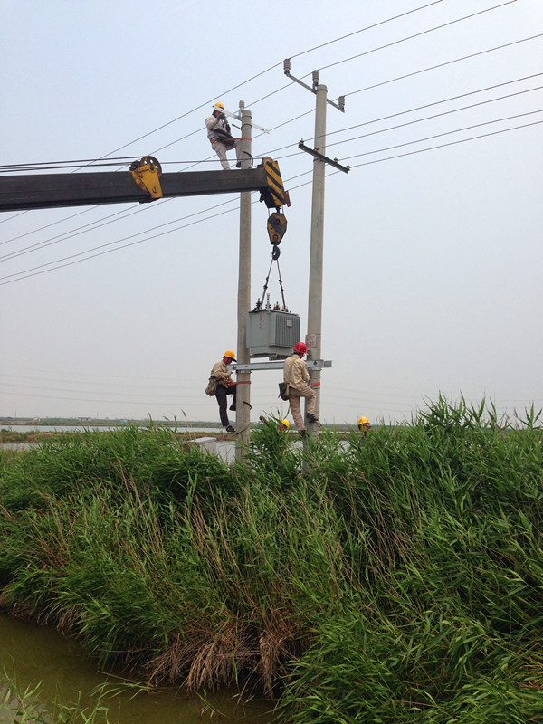 為了保證夏季高溫期,大新水庫(kù)2000畝淡水池塘配變盡快安裝到位。6月16日,該支部組織全體黨員開(kāi)展了黨員奉獻(xiàn)日活動(dòng),全體黨員早晨7點(diǎn)鐘上班,工作近9小時(shí),他們不怕天氣炎熱,不怕施工難度大,為職工做出了表率。圖為職工在施工中(宋忠文)