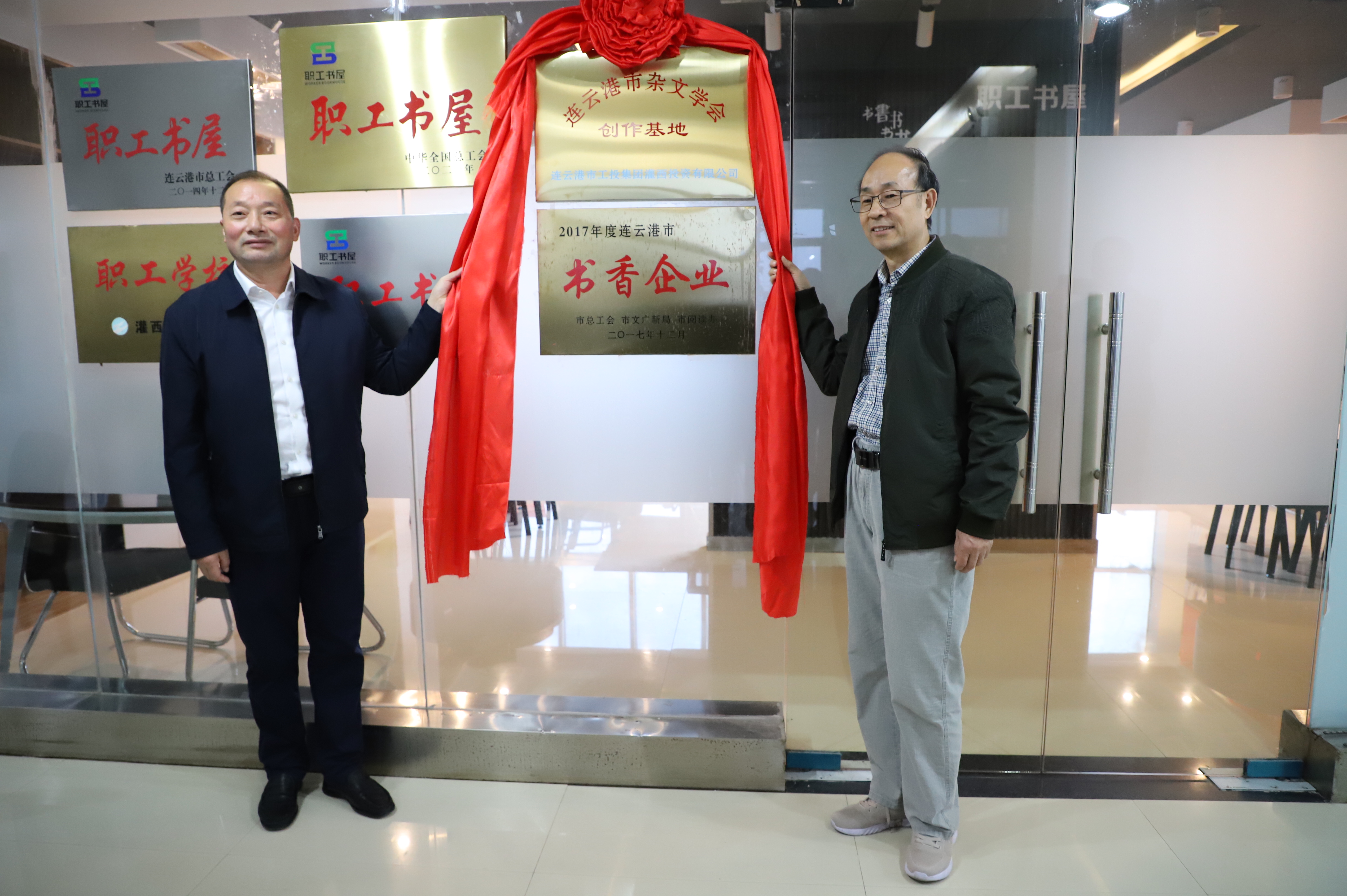 11月3日,連云港市雜文學會創(chuàng)作基地掛牌儀式在灌西投資公司職工書屋舉行,市雜文學會會長李正冬一行為灌西公司授牌,公司黨委書記、董事長、總經(jīng)理李國文,黨委副書記、工會主席王宏等參加掛牌儀式。