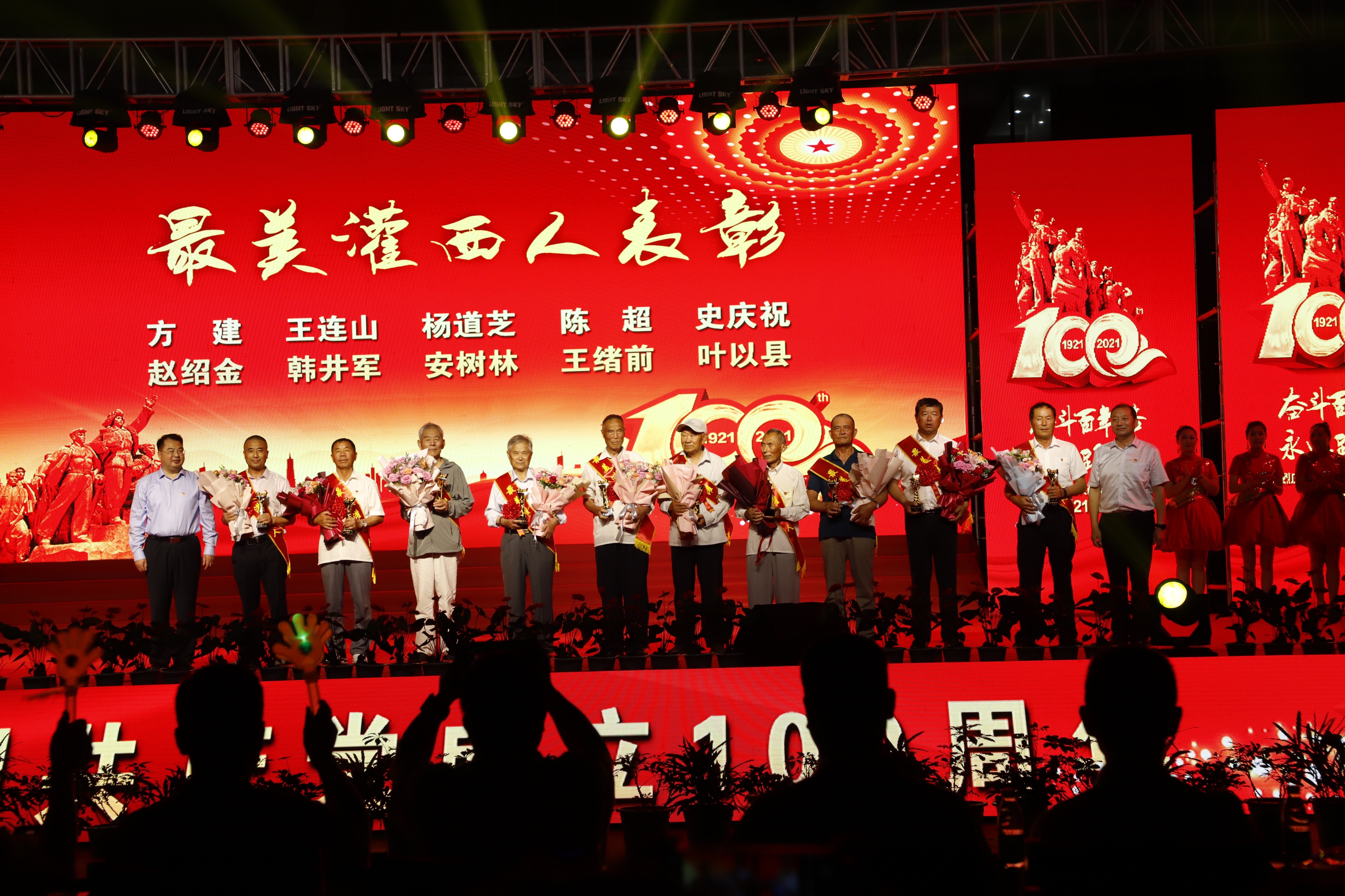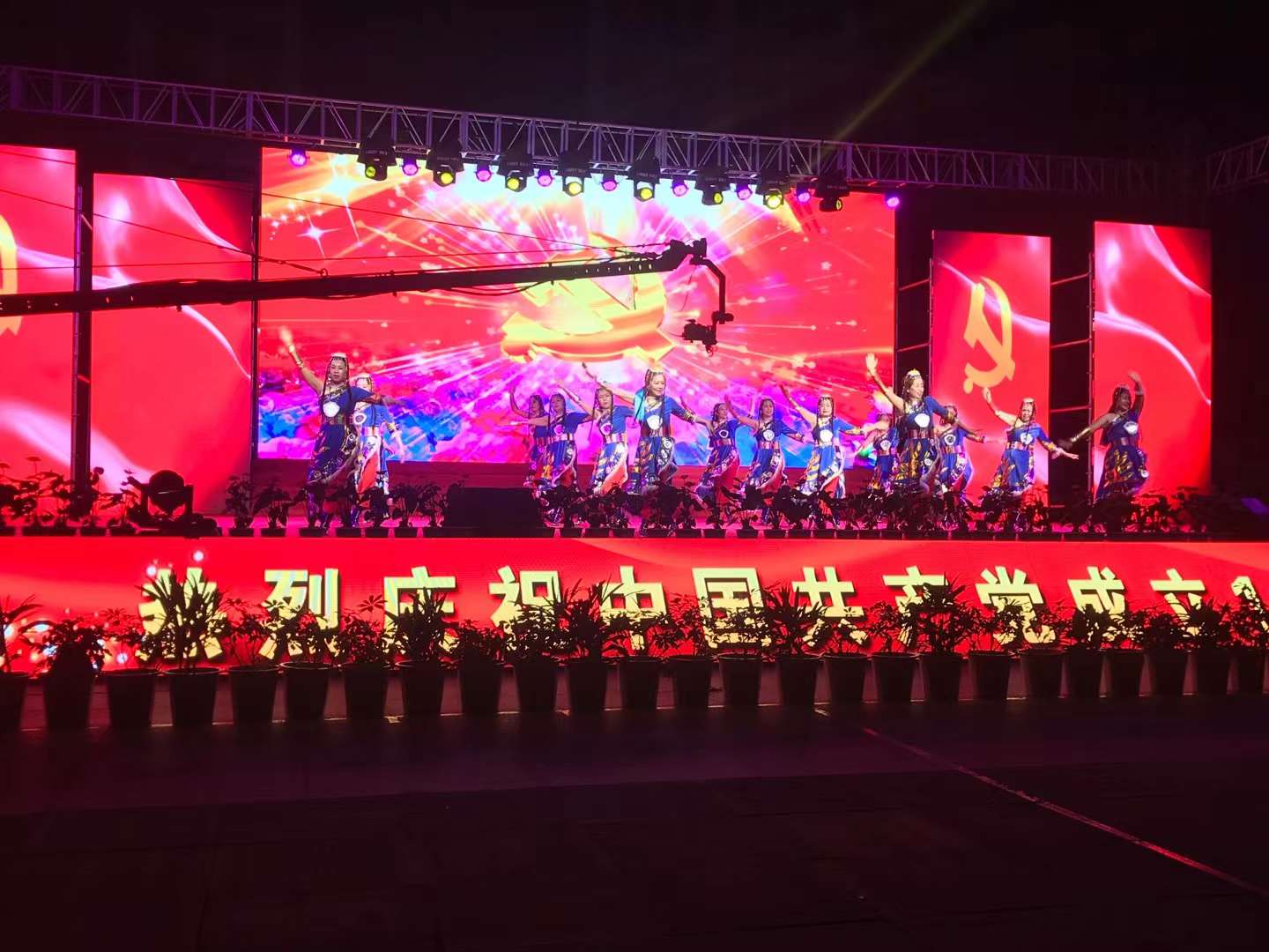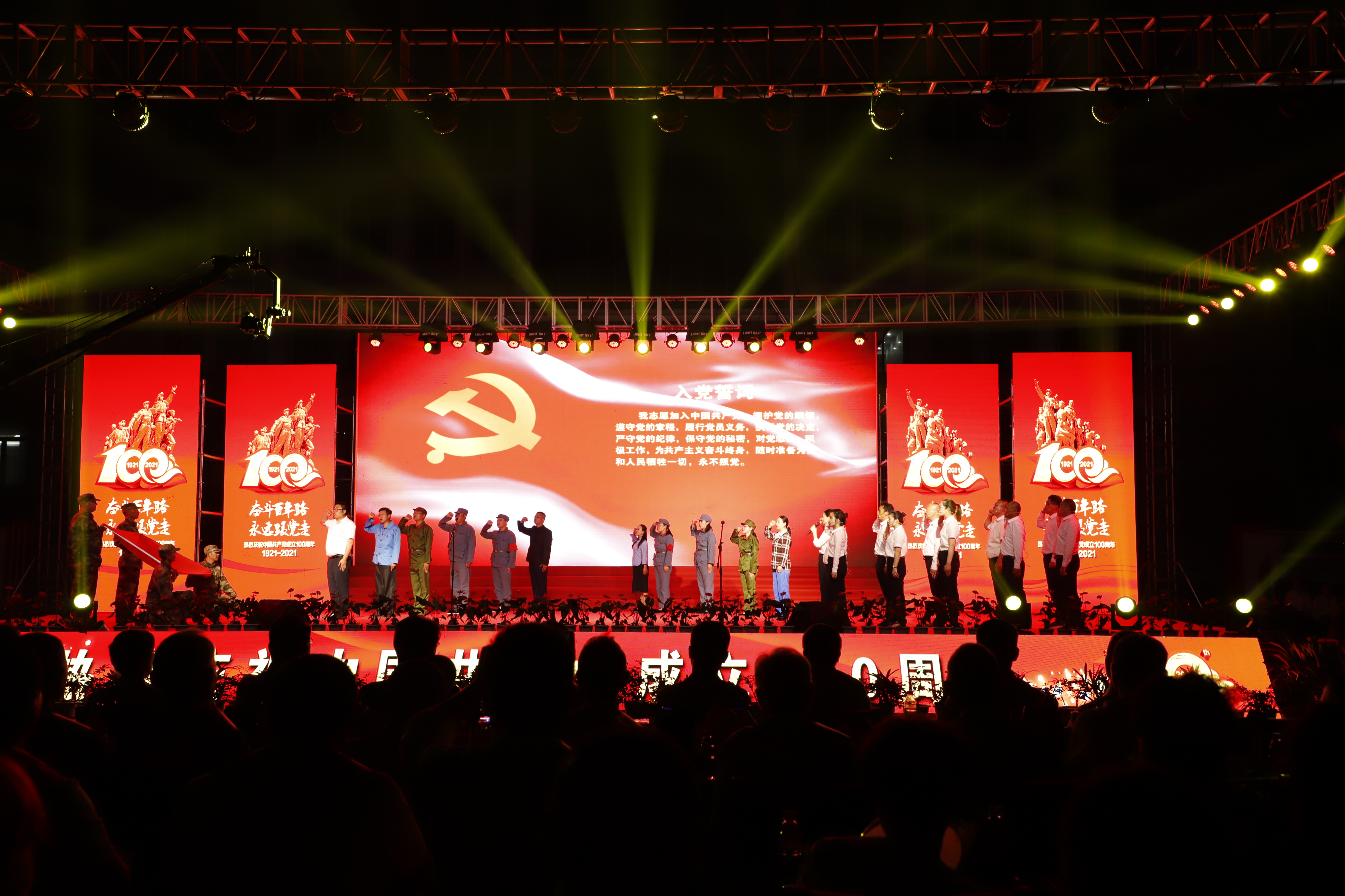 百年征程路漫漫,燦爛輝煌激人心,是中國(guó)共產(chǎn)黨指給了人民解放的道路,領(lǐng)導(dǎo)中國(guó)走向光明,是中國(guó)共產(chǎn)黨引領(lǐng)中華民族走向復(fù)興之路,奮進(jìn)新時(shí)代、開啟新征程,最后,全場(chǎng)人員同唱《沒有共產(chǎn)黨就沒有新中國(guó)》,10面國(guó)旗、10面黨旗在揮舞,整個(gè)舞臺(tái)成為一片紅的海洋,整場(chǎng)晚會(huì)圓滿落下帷幕。