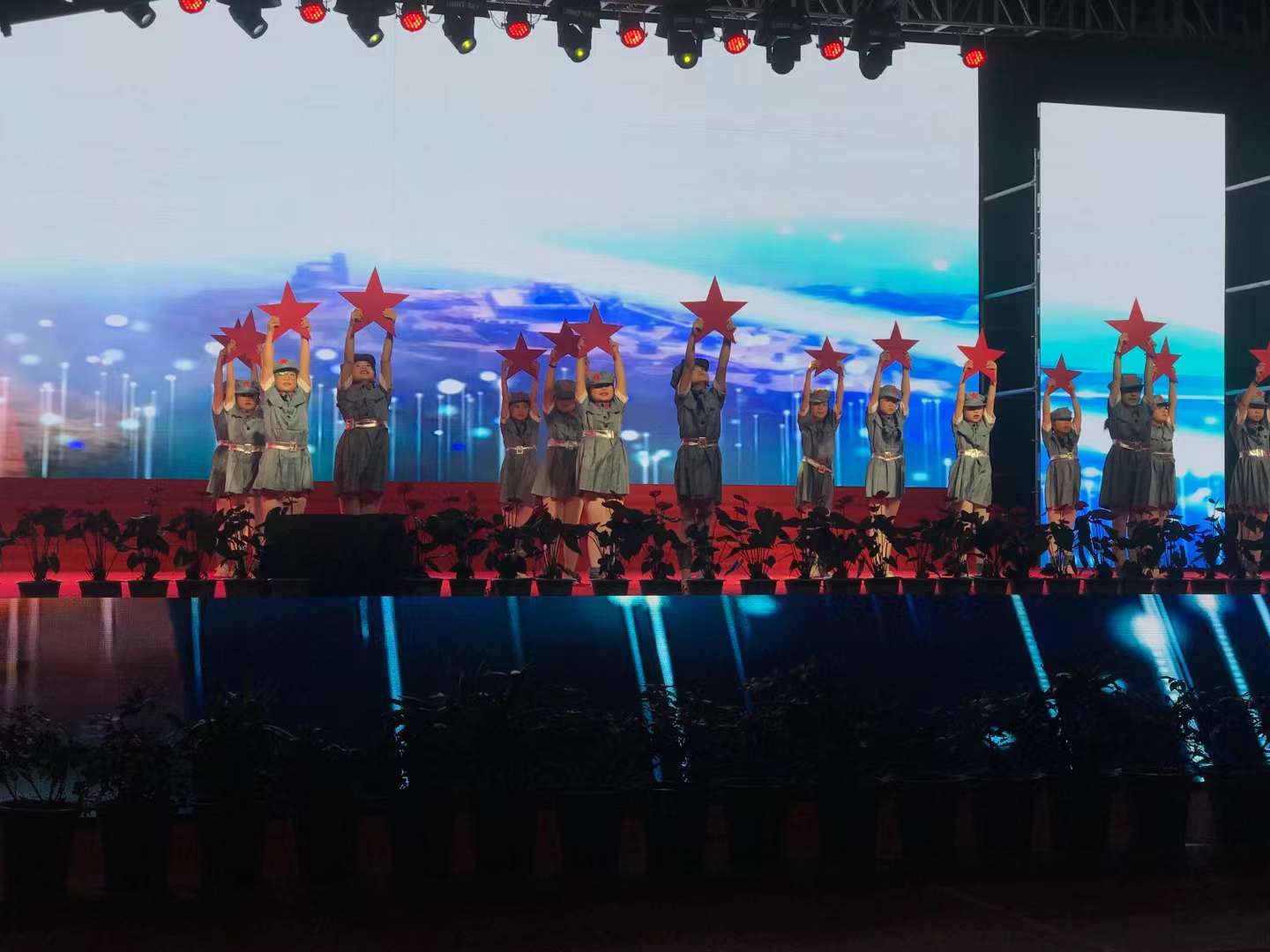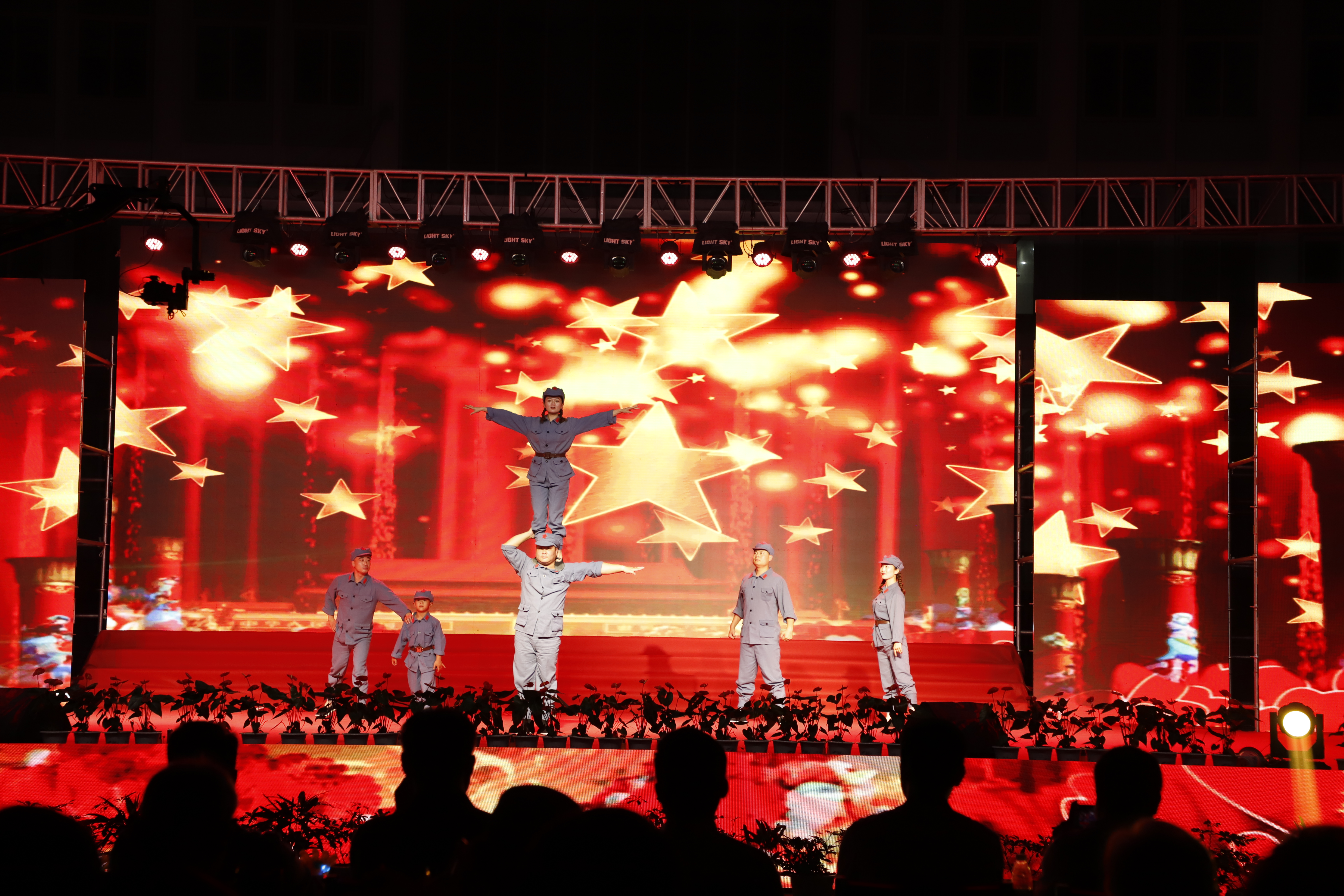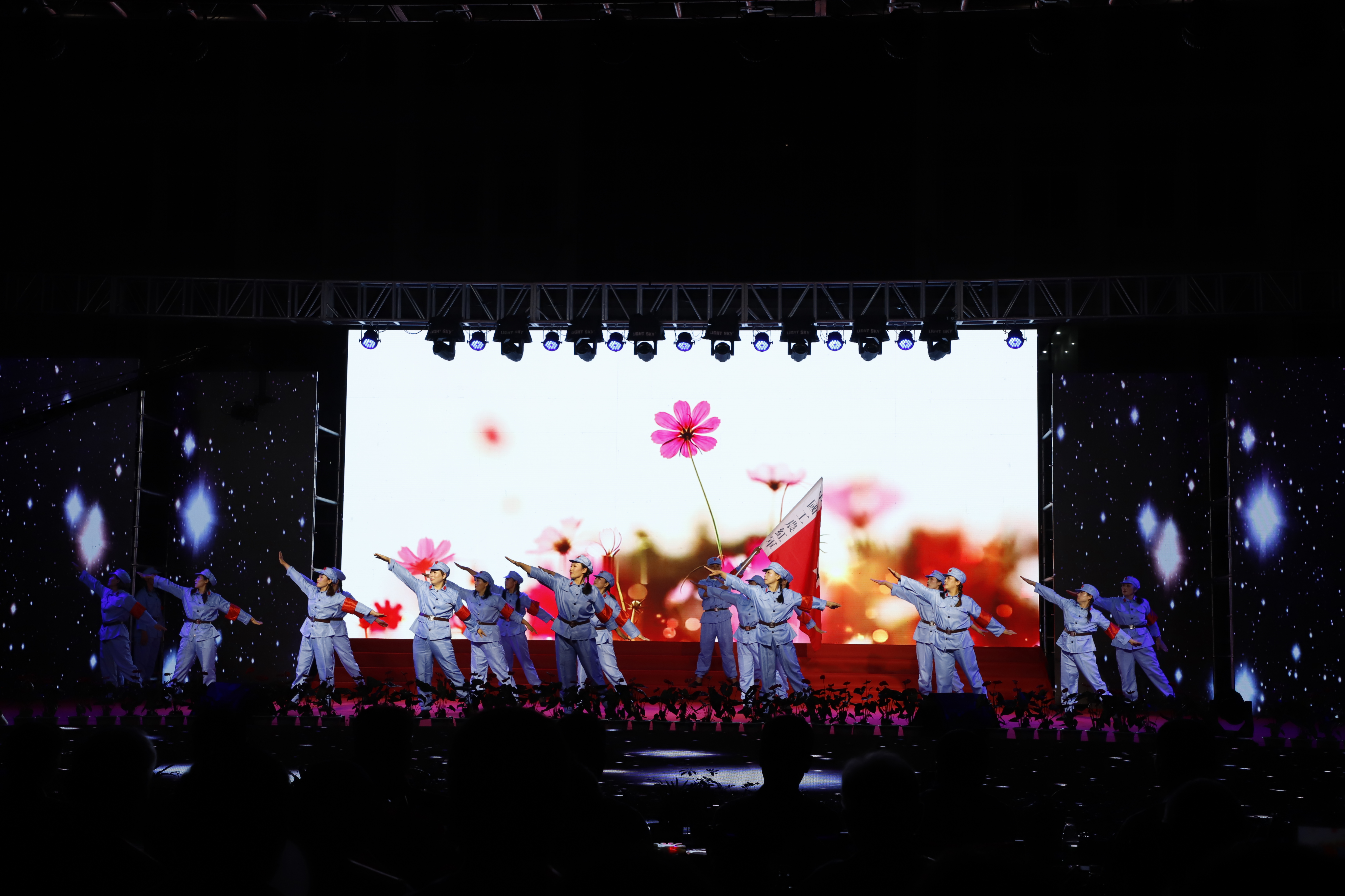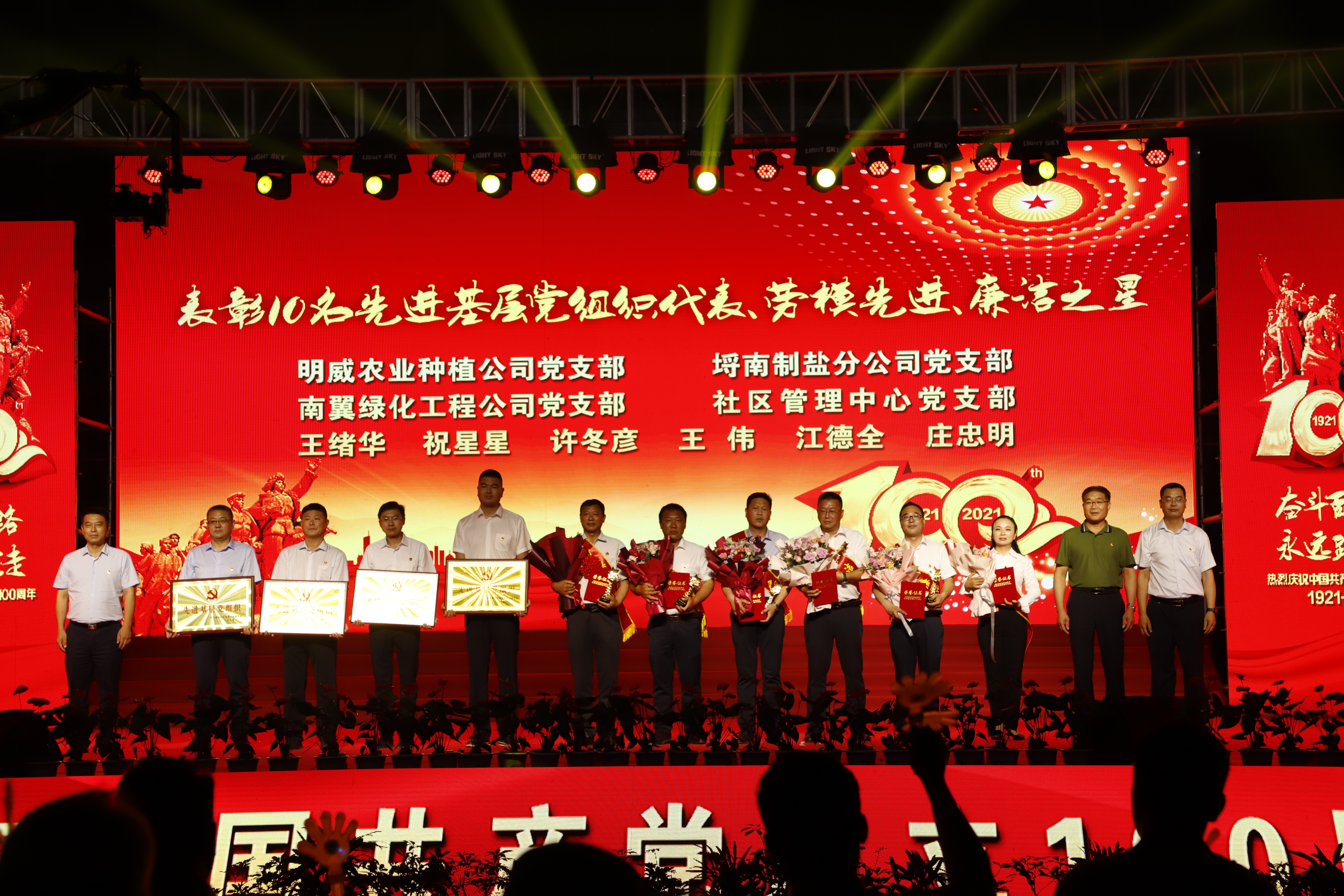 百年征程路漫漫,燦爛輝煌激人心,是中國(guó)共產(chǎn)黨指給了人民解放的道路,領(lǐng)導(dǎo)中國(guó)走向光明,是中國(guó)共產(chǎn)黨引領(lǐng)中華民族走向復(fù)興之路,奮進(jìn)新時(shí)代、開啟新征程,最后,全場(chǎng)人員同唱《沒有共產(chǎn)黨就沒有新中國(guó)》,10面國(guó)旗、10面黨旗在揮舞,整個(gè)舞臺(tái)成為一片紅的海洋,整場(chǎng)晚會(huì)圓滿落下帷幕。