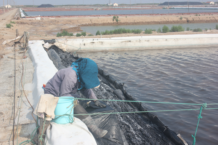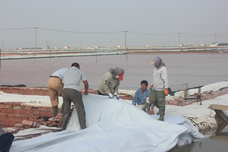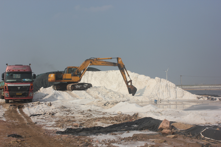 隨后我們又來到了新河制鹽分公司十四班的裝鹽現(xiàn)場。一位工人操作著挖掘機(jī),往卡車上裝鹽銷售,如今裝鹽實(shí)現(xiàn)了機(jī)械化,工人的勞動負(fù)荷也減輕了許多。在埒南制鹽分公司的五班,我們看到七八個工人正在灘頭更換土工布,他們一字排開,先將土工布鋪開,然后分工合作,有的人負(fù)責(zé)把布理齊鋪平,有的則把磚頭鋪放在布上用來固化。