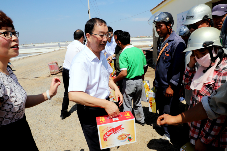 入伏以來,持續(xù)高溫,為確保一線生產(chǎn)單位工作順利開展,保證員工身體健康。7月18日上午,集團(tuán)公司總經(jīng)理胡建明、副總經(jīng)理張其海一行深入日曬制鹽公司走訪慰問一線職工,把綠豆、飲料等慰問品送到他們手中,在炎炎夏季,為一線職工送去集團(tuán)公司領(lǐng)導(dǎo)的深切關(guān)懷與陣陣清涼。