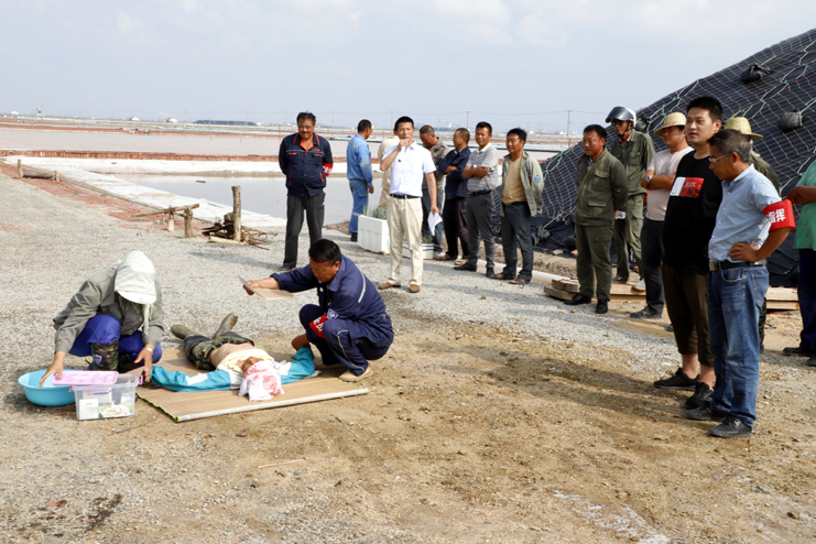 當天下午正直高溫天氣,室外環境悶熱。現場,鹽工孫良成在烈日下工作幾個小時后早已汗流浹背,堅持工作一段時間后,感到頭暈目眩,支持不住倒在了鹽池邊上。現場安全員張軍連第一時間趕到現場,根據經驗,初步判斷倒地者出現了中暑癥狀。立即組織員工董志波和曹軍華將孫良成抬至陰涼通風處,側臥后仰頭部,保持其呼吸暢通。并解開他身上的衣扣,一邊為他扇風送涼。大伙一邊用溫濕毛巾不斷為他擦拭身體降溫,一邊喂他服下藿香正氣水,并用清涼油、風油精等擦拭額頭位置。在現場急救迅速開展的同時,班長林樹軍立即向埒南分公司安全負責人江躍匯報,江躍到達現場了解情況并通知公司經理楊守斌,同時通知120急救中心,幾分鐘后,120急救人員趕到現場,并對中暑人員進行施救,經過緊張有序的急救,患者逐漸蘇醒并初步恢復神智,抬上救護車送去醫院,至此演練結束。