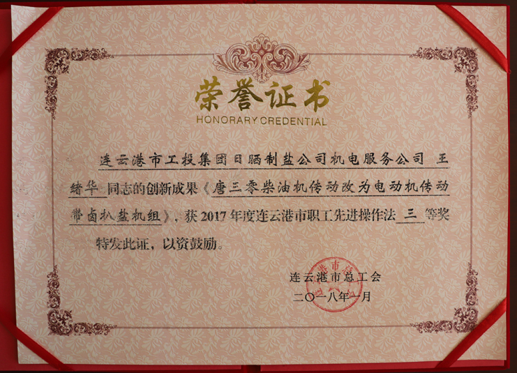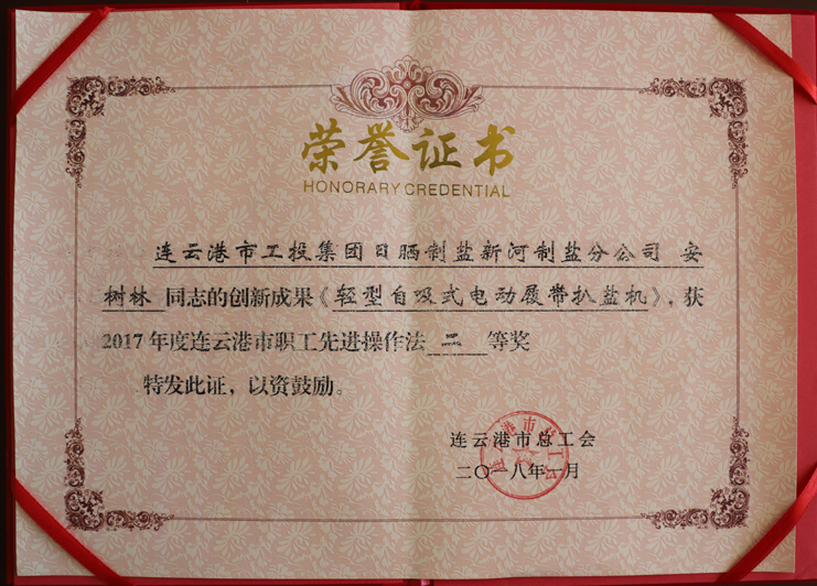 近日,日曬制鹽新河制鹽分公司安樹林同志的創(chuàng)新成果《輕型自吸式電動履帶扒鹽機》,被市總工會評為2017年度連云港市職工先進操作法二等獎,日曬制鹽公司機電服務(wù)公司王緒華同志的創(chuàng)新成果《唐三零柴油機傳動改為電動機傳動帶鹵扒鹽機組》,被市總工會評為2017年度連云港市職工先進操作法三等獎。(西工)