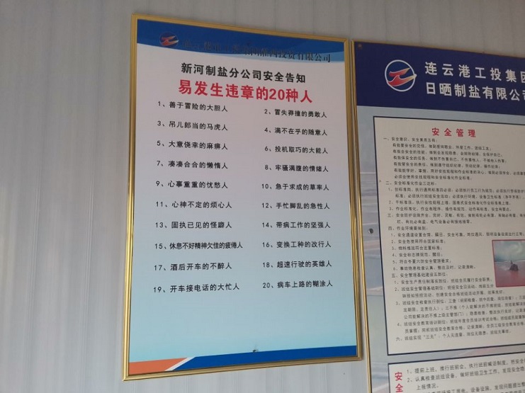 4月25日,新河制鹽分公司對16個產鹽班組安全活動室加裝安全告知牌,這是該公司防范人為因素造成安全事故,確保安全生產形勢穩定采取的措施之一。