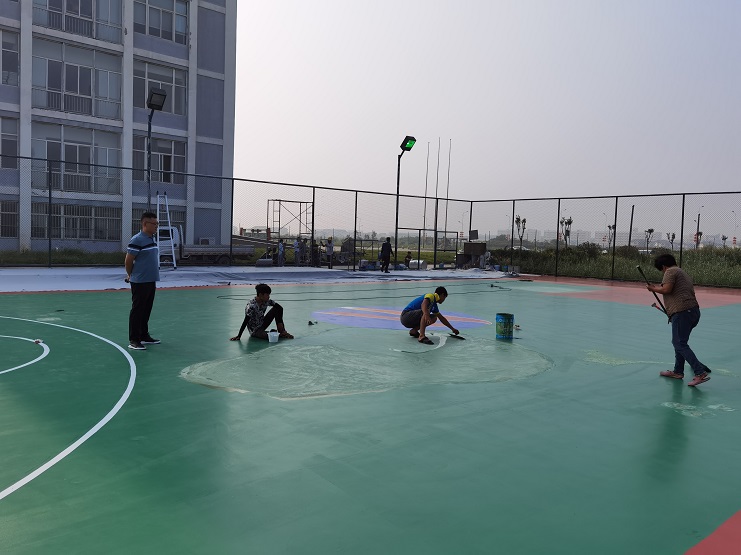 灌西籃球場總面積約510平米,附屬球場地面600平米,外圍護欄高3米。項目圍繞關鍵節點及重難點,強化施工組織,統籌施工進展。籃球場地面露天暴曬,溫度極高,仿佛蒸籠一般。施工人員在進行鑿地、涂漆時,僅幾分鐘的功夫,衣服從里到外被汗水浸濕,隨時有中暑的可能性,項目組把責任明確到個人,開展班前安全教育活動,保證施工安全。施工單位南翼工程公司負責人錢明偉克服人員緊缺,工期緊迫等問題,頂著高溫,始終奮戰在工程項目第一線。