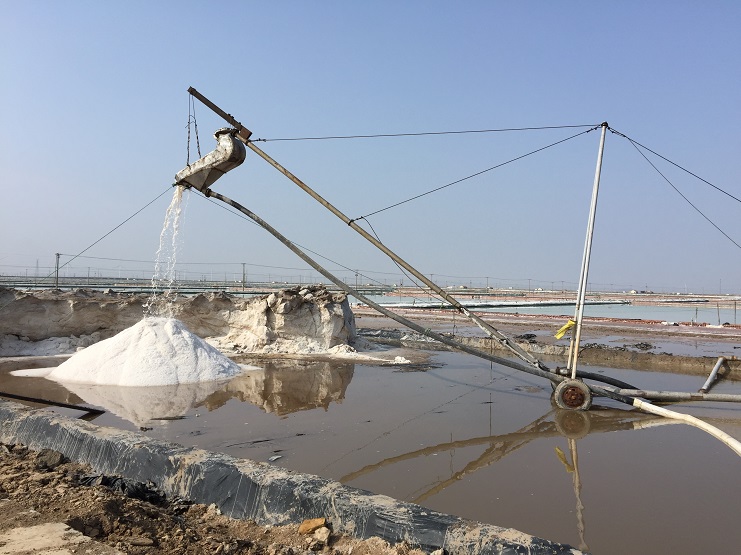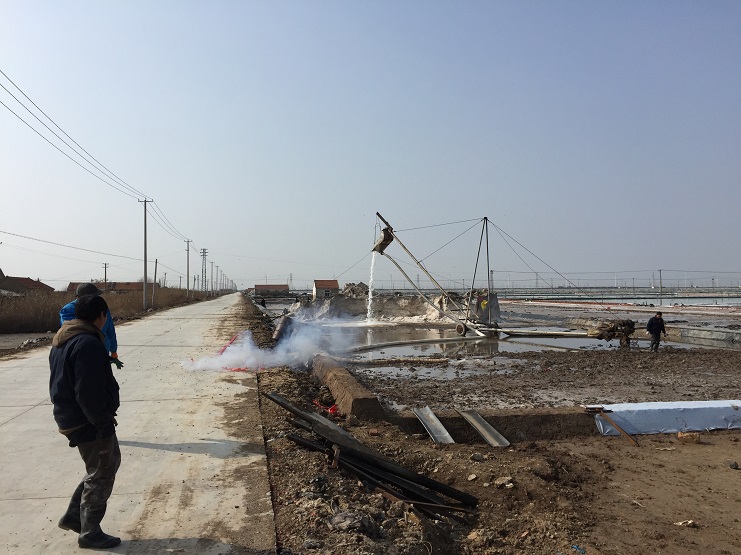 2月25日上午九點十八分,伴隨著鞭炮聲清脆響起,新河制鹽分公司五班二號扒鹽機組輸鹽大架銀瀑飛濺,拉開了新河制鹽春季扒鹽的序幕。