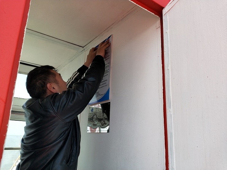 宵洋物流公司強化安全生產工作。近期,宵洋物流公司維修人員,在碼頭起重吊機底座、駕艙內張貼安全警示和吊機駕駛員規章制度圖片,時刻提醒碼頭作業人員安全作業。自碼頭噸袋吊裝業務三月十八日正式啟動以來,安全作業狀況良好。(宵洋物流公司)