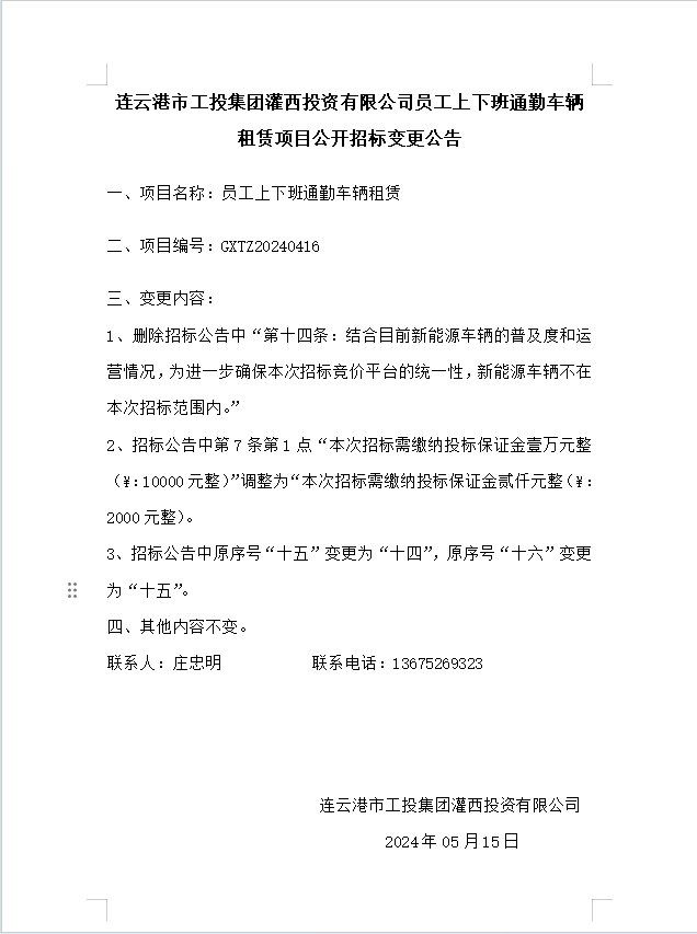 連云港市工投集團灌西投資有限公司員工上下班通勤車輛租賃項目公開招標變更公告