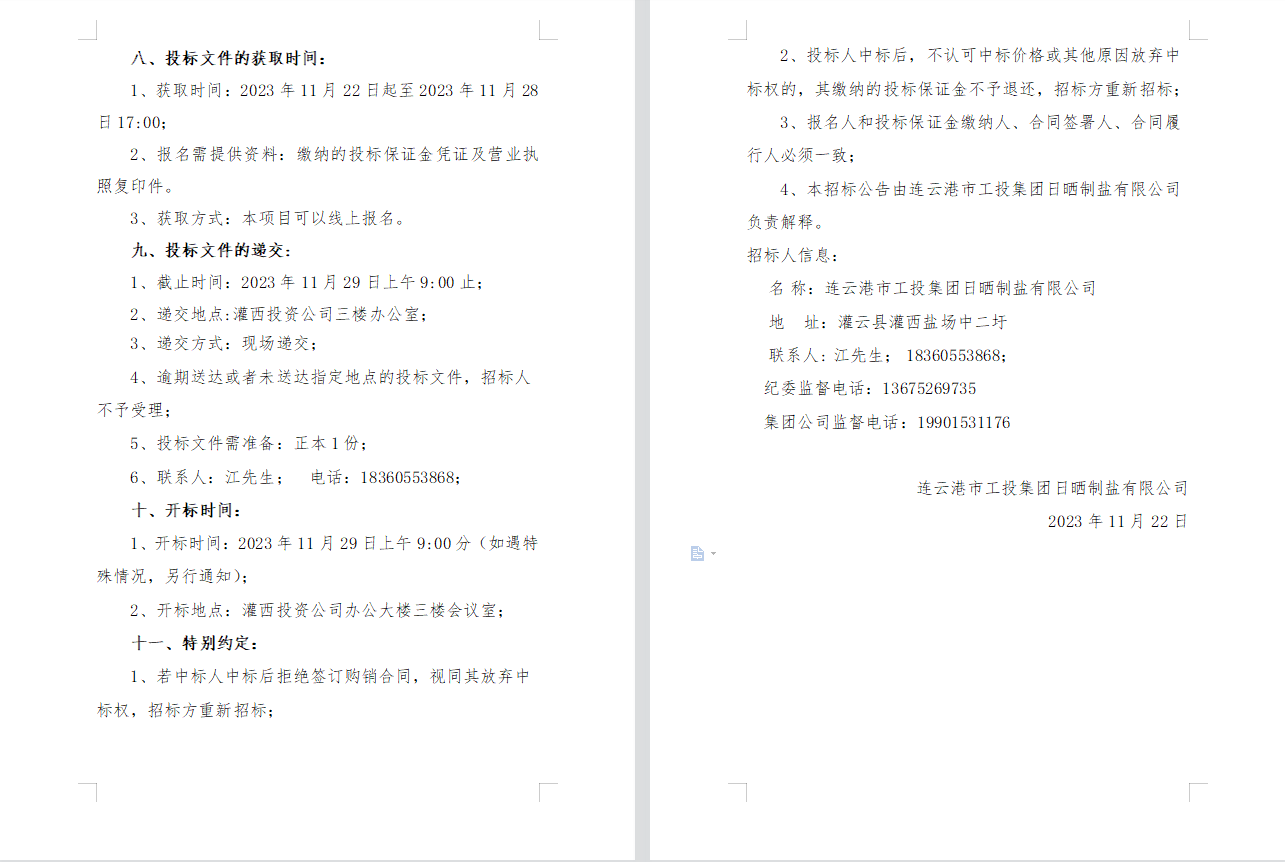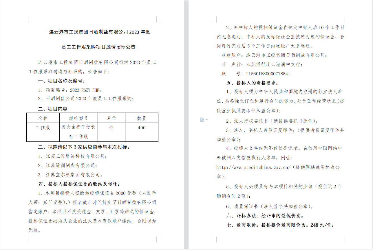 連云港市工投集團日曬制鹽有限公司2023年度員工工作服采購項目邀請招標(biāo)公告