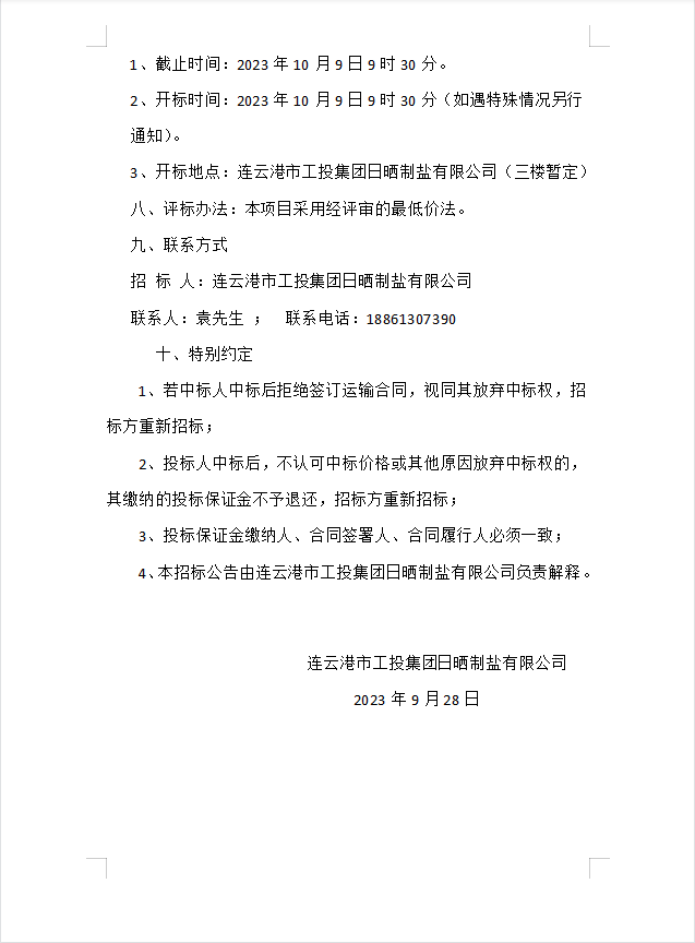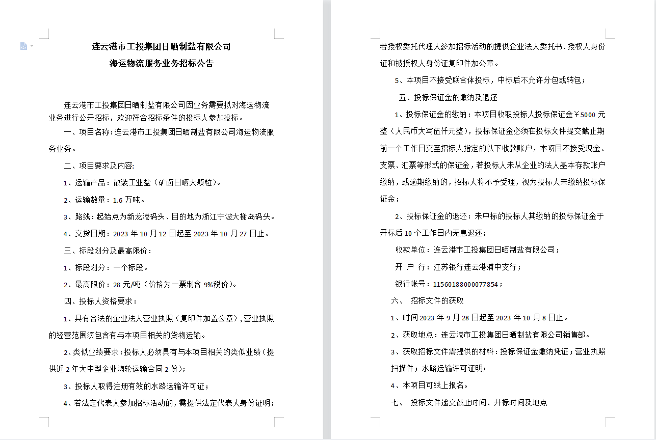 連云港市工投集團(tuán)日曬制鹽有限公司海運物流服務(wù)業(yè)務(wù)招標(biāo)公告