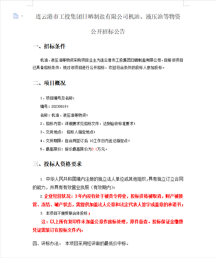 連云港市工投集團(tuán)日曬制鹽有限公司機(jī)油、液壓油等物資公開招標(biāo)公告