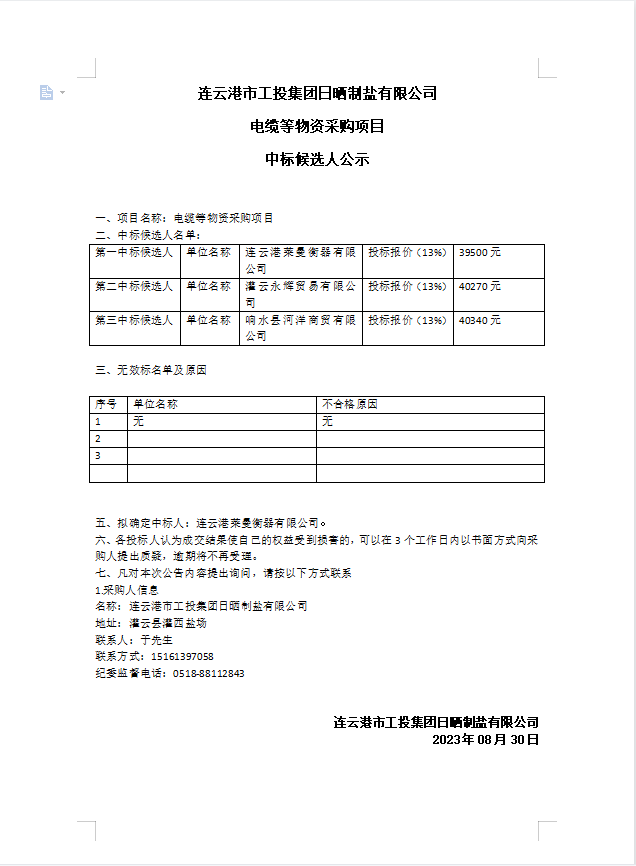 連云港市工投集團(tuán)日曬制鹽有限公司電纜等物資采購項(xiàng)目中標(biāo)候選人公示
