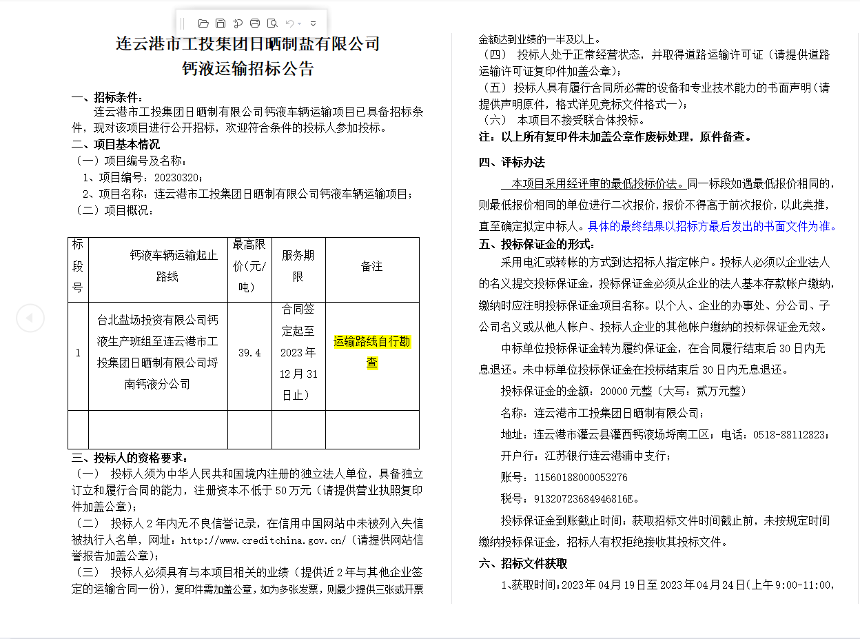 連云港市工投集團(tuán)日曬制鹽有限公司鈣液運(yùn)輸招標(biāo)公告