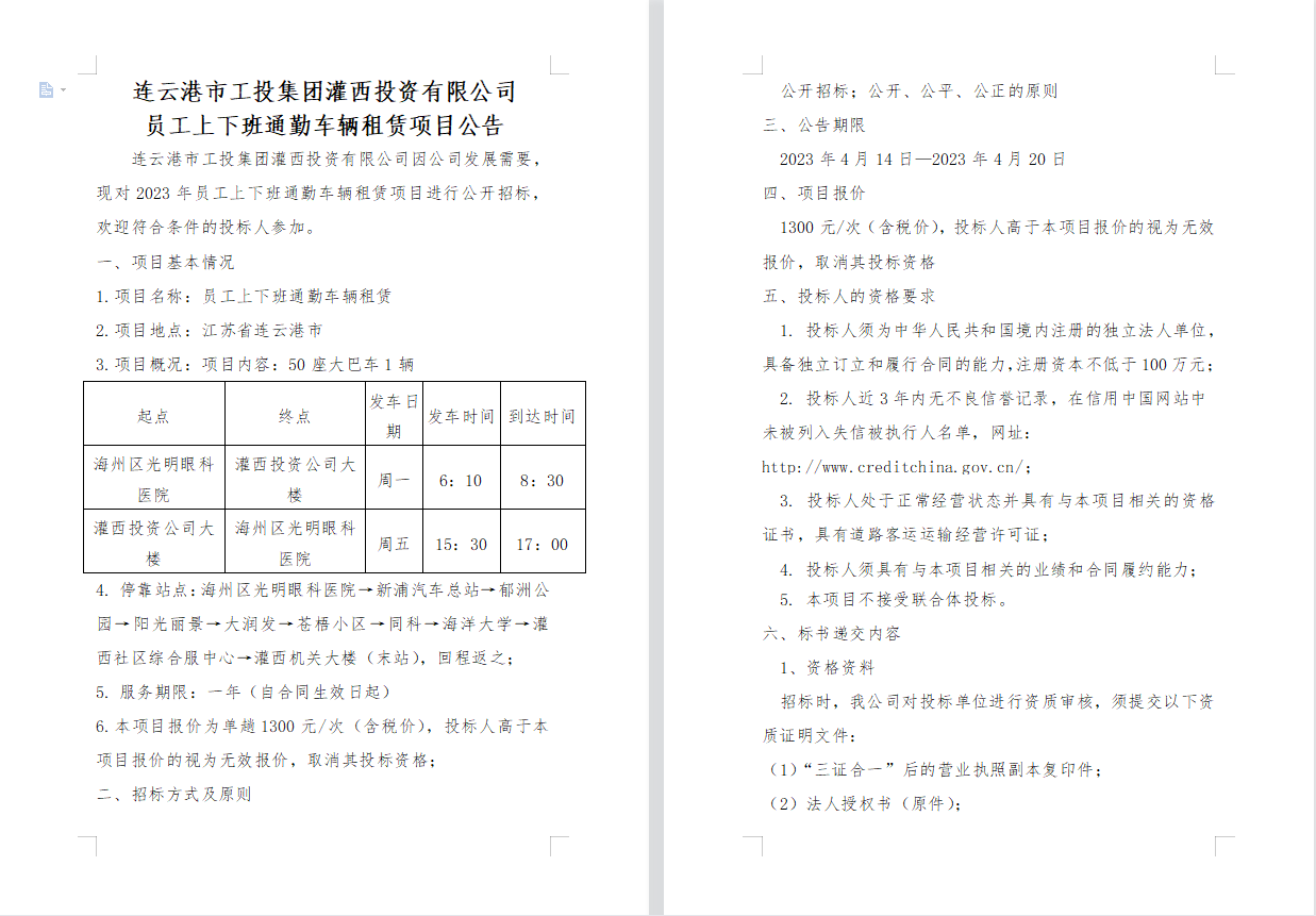 連云港市工投集團(tuán)灌西投資有限公司 員工上下班通勤車輛租賃項(xiàng)目公告