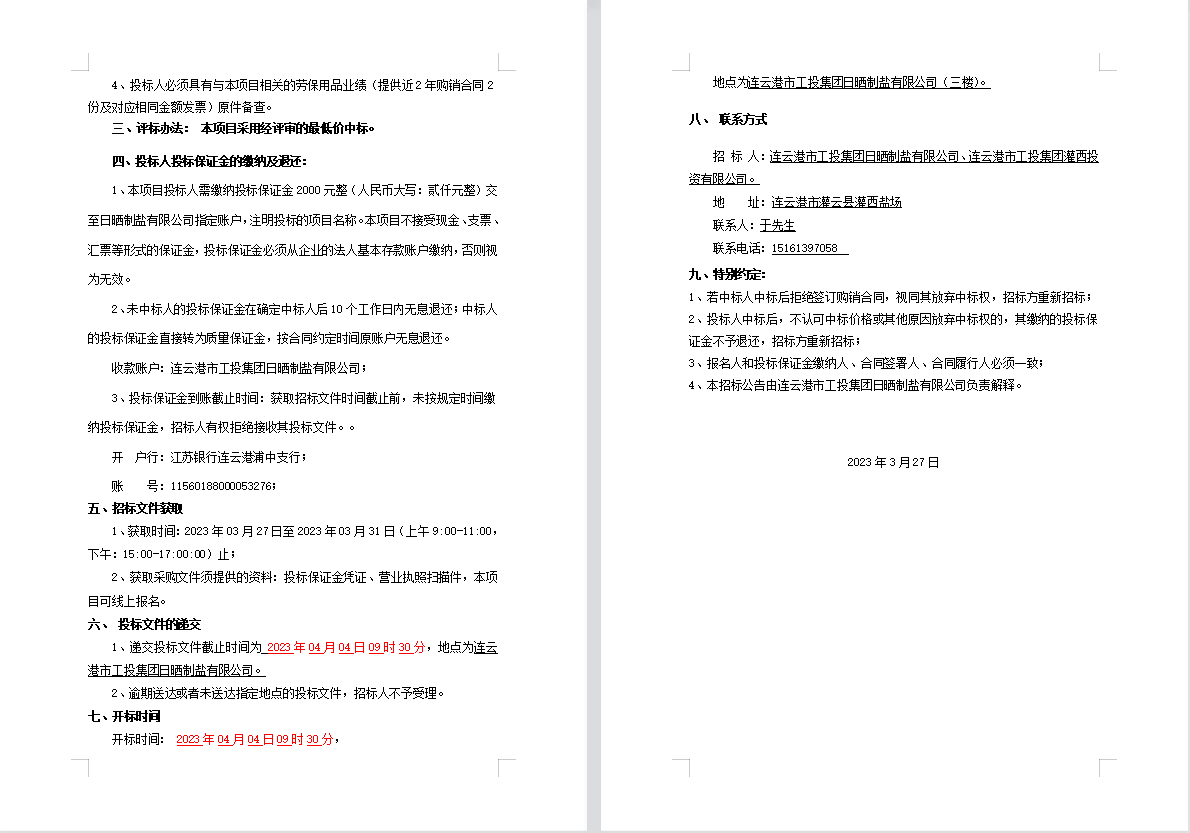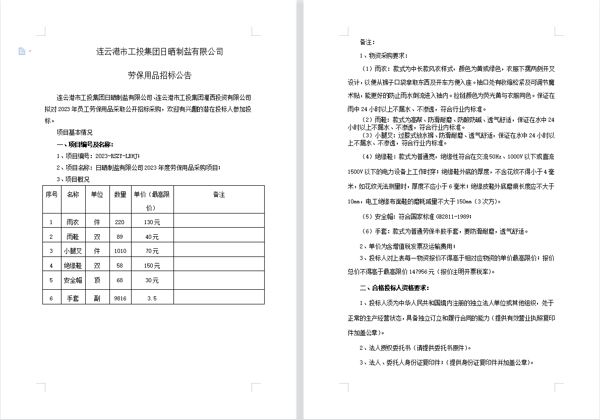 連云港市工投集團日曬制鹽有限公司勞保用品招標(biāo)公告