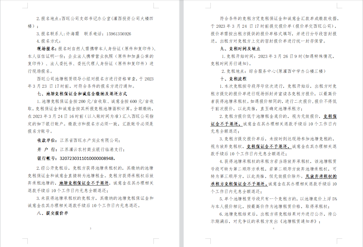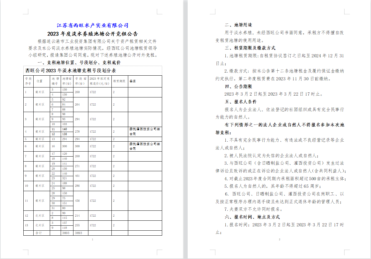 江蘇省西旺水產(chǎn)實(shí)業(yè)有限公司2023年度淡水養(yǎng)殖池塘公開競(jìng)租公告