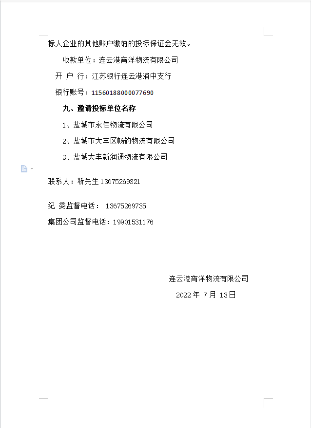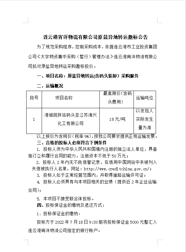 連云港宵洋物流有限公司原鹽異地轉(zhuǎn)運邀標公告