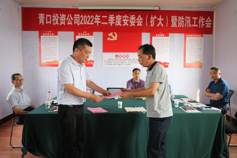 演練結(jié)束后,工作會在承擔主要防汛任務(wù)的三洋分場召開。會上,生產(chǎn)安全部匯報二季度安全工作情況,副總經(jīng)理許太冬傳達《關(guān)于深刻汲取近期事故教訓采取嚴厲措施堅決遏制事故多發(fā)勢頭的通知》,副總經(jīng)理楊守明布置公司安全工作及防汛工作,各單位遞交2022年度防汛工作責任書。