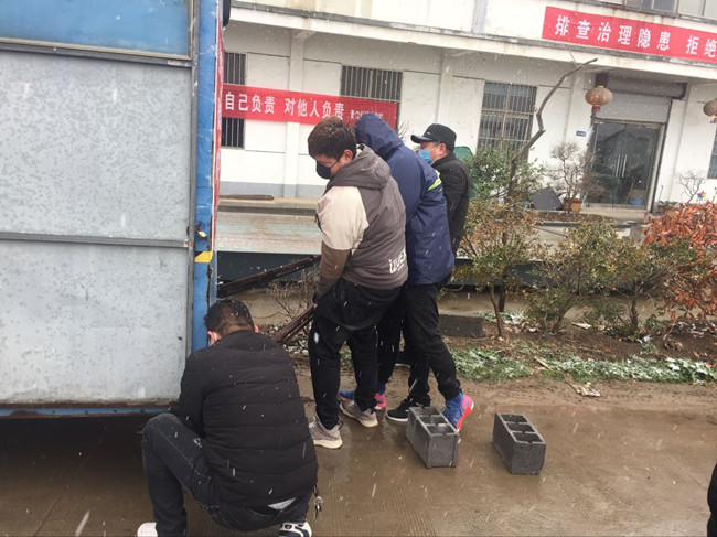 公司黨委書(shū)記、董事長(zhǎng)胡傳法冒雪檢查成業(yè)飼料卡口,胡書(shū)記囑咐在現(xiàn)場(chǎng)值班的團(tuán)青干部防控一線,要?jiǎng)诱娓癫荒芎瑘?jiān)決不給外來(lái)車(chē)輛通過(guò)。負(fù)責(zé)這里還有生產(chǎn)生活服務(wù)中心和黃沙分場(chǎng)的全體管理干部,大家都很辛苦,但沒(méi)有埋怨,都在默默地堅(jiān)守崗位,履行職責(zé)。“你不站崗我不站崗,誰(shuí)保衛(wèi)咱大場(chǎng)”他們是這樣說(shuō)也是這樣做的。為了讓值守人員有一個(gè)溫暖的臨時(shí)休憩的場(chǎng)所,泰祥公司將一個(gè)臨時(shí)集裝箱拉到卡口,后勤班的小伙子們,搬運(yùn)調(diào)試固定,絲毫沒(méi)有因?yàn)楹涞奶鞖庥绊懝ぷ鬟M(jìn)度。