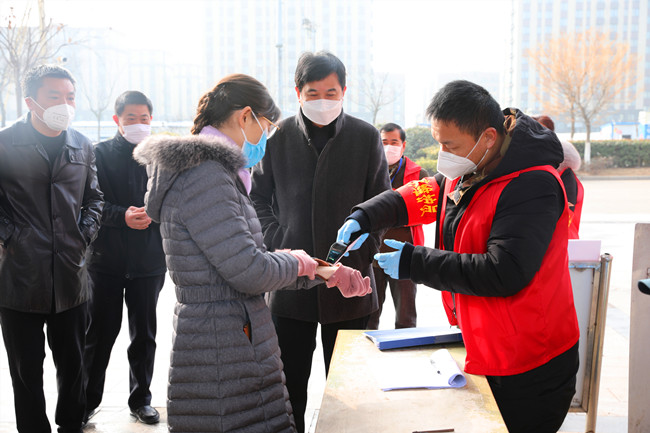 汪書記一行在公司疫情防控檢查站前,詳細了解了公司疫情防控情況,青農一路作為主要的進場通道,四個單位的黨員干部輪流值班,并設置臨時看護房,保證二十四小時值班。在鹽場家園小區(qū)僅保留一個出口,外來家用轎車一律禁止入內,每戶發(fā)一張通行證,嚴格管控人員流動。汪書記得知物業(yè)公司還沒有完成,鼓勵大家非常時期用非常辦法,將工作做細做實,想居民所想,嚴格做好防控工作。進入小區(qū)前,汪書記也與居民一樣配合登記和測量體溫,當看物業(yè)為了保證每天定時對單元和電梯間等重要場所的消毒存有大量消毒液,強調物業(yè)公司要增強消毒物品存放安全意識,合理使用,盡最大努力保一方平安。