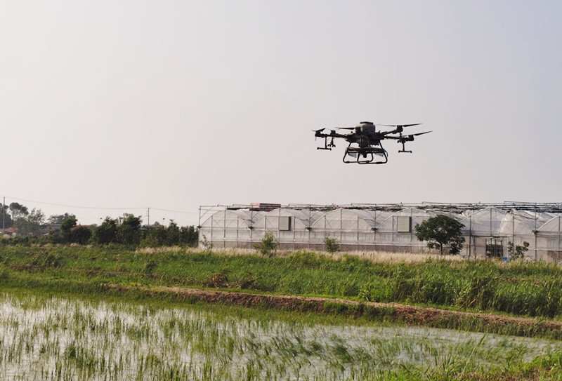 夏至水門開,接連幾天的暴風雨,田間道路泥濘。6月28日下午,天氣剛剛轉(zhuǎn)晴,倉儲中心抓住有利天時,緊爭農(nóng)務(wù),搶抓農(nóng)時節(jié)點,采用無人機為水稻田有序開展追肥工作。(姜姝妍)