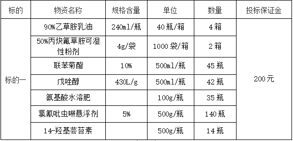 3.原則上由投標(biāo)單位按貨物需求進(jìn)行投標(biāo),若規(guī)格不符,投標(biāo)單位也可以根據(jù)自有包裝規(guī)格進(jìn)行投標(biāo)。本次招標(biāo)采購(gòu),確定生產(chǎn)廠家或代理商、農(nóng)藥品種、規(guī)格、劑型和農(nóng)藥單價(jià)。