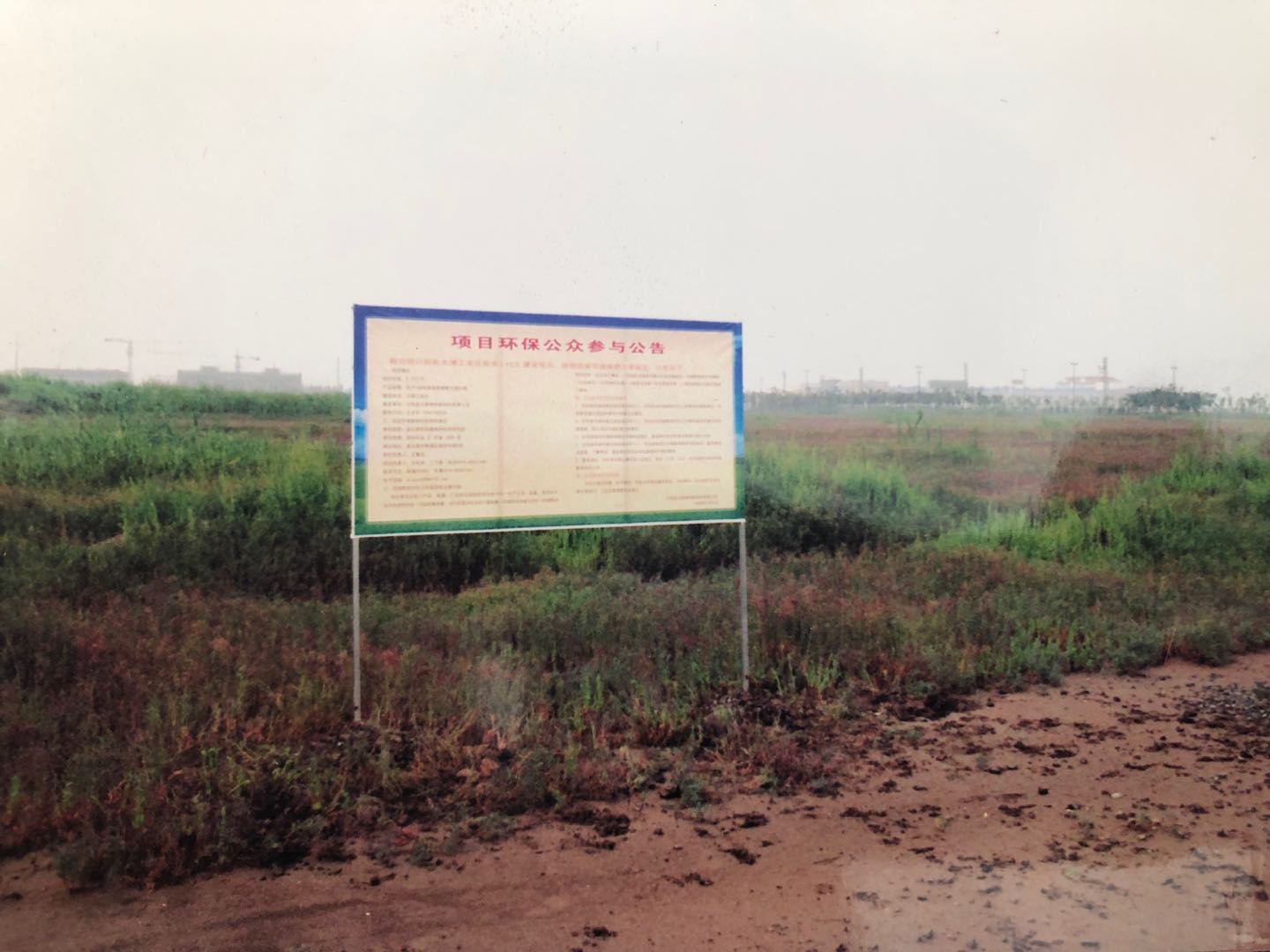這是神特公司籌建時期的環(huán)評現(xiàn)場公示照片,是2008年8月底拍攝的。照片的重點部分是一個大牌子——項目環(huán)保公眾參與公告的牌子,位置大約在現(xiàn)在一期傳達室附近。做這樣的牌子是當時環(huán)評的一個環(huán)節(jié),必須在建設(shè)場地進行兩次公告,征求相關(guān)環(huán)境利益方的訴求。牌子的遠方隱隱約約看見有些工廠和電力桿塔,牌子附近生長著茂密的堿蒿,一團團一簇簇,忽高忽低,可以看出地面是很不平整的。當年豎牌子的時候,是雨后不久,地面較為泥濘,建設(shè)用地及周邊環(huán)境多多少少透射出一種蒼涼的感覺。