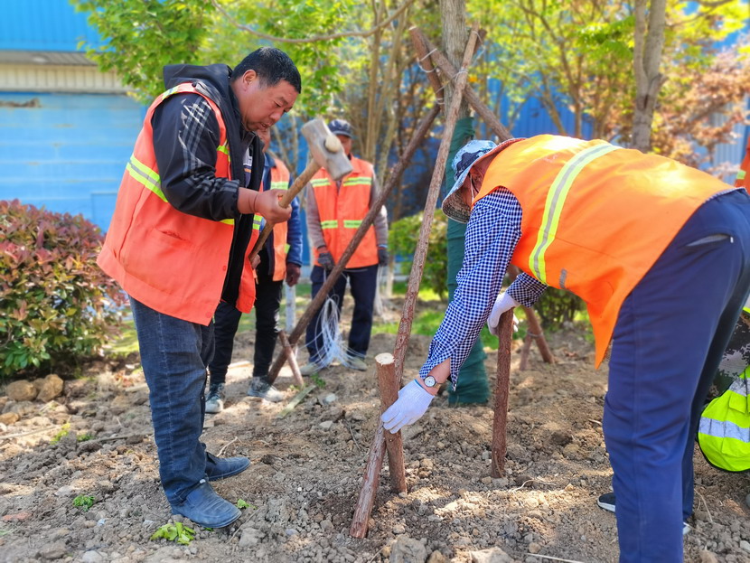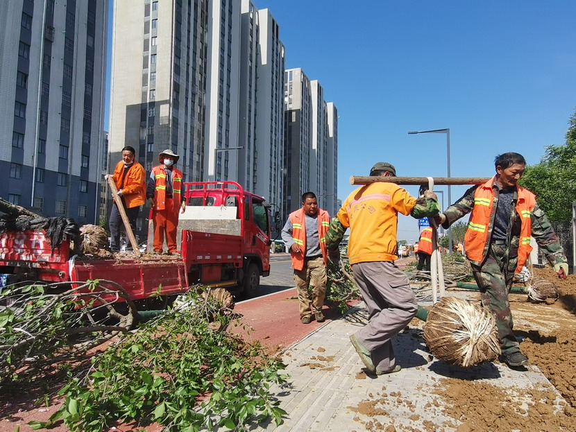 在中科院,只見工程車輛來來往往、橙色身影忙忙碌碌……到處都是一派繁忙、紅紅火火的景象。闖將孫玉虎,虎將金華穿梭在工程現(xiàn)場,親自指揮調(diào)度綠化工程收尾工作。大家分工有序:定點(diǎn)劃線、搬運(yùn)苗木、栽植澆水、垃圾清理……有條不紊。中午時(shí)分,熾熱的陽光照在臉上也是火辣辣的,忙碌了一上午的工人大汗淋漓,擰開瓶蓋,咕嚕咕嚕喝了幾大口涼水,用袖子蹭了下額頭的汗,又干勁十足地投入到工作中。