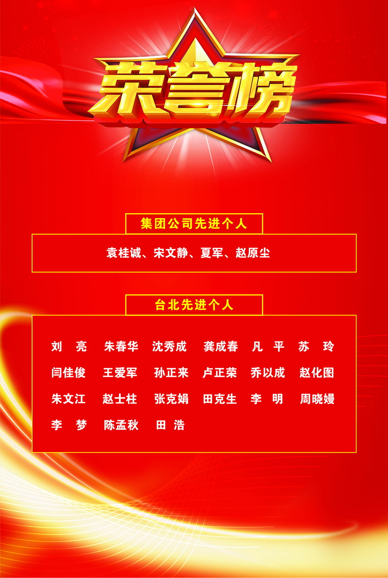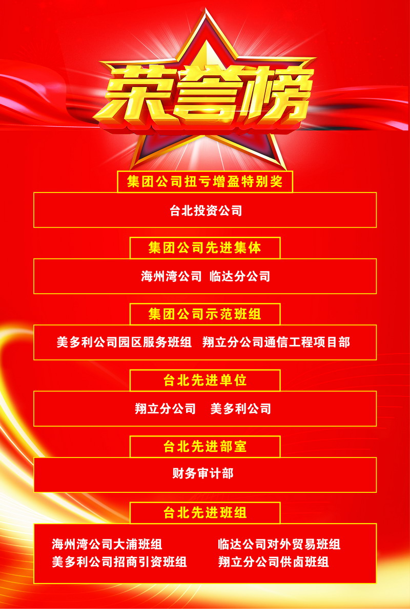 臺北投資公司連續(xù)兩年被集團(tuán)公司授予“扭虧增盈特別獎”;海州灣公司、臨達(dá)分公司被評為先進(jìn)集體;美多利公司園區(qū)服務(wù)班組、翔立分公司通信工程項目部被評為示范班組;夏軍、趙原塵、袁桂誠、宋文靜被評為優(yōu)秀員工。