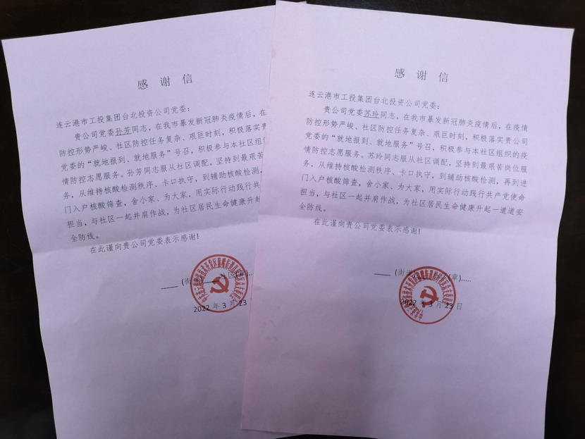 “臺(tái)北投資公司的黨員同志們視疫情防控為己任,服從調(diào)度安排,站好每一班崗,不僅認(rèn)真履行防控職責(zé),又創(chuàng)新開展疫情防控教育宣傳、便民服務(wù)等多項(xiàng)活動(dòng),成為我們社區(qū)防疫攻堅(jiān)的主力軍。”3月25日,收到開發(fā)區(qū)猴嘴街道昌圩社區(qū)送來的一份特殊的“禮物”— 一封疫情防控感謝信,感謝臺(tái)北投資公司黨員蘇玲、孫芳等同志在新冠肺炎疫情防控的關(guān)鍵階段挺身而出、伸出援手,參與協(xié)助社區(qū)的疫情防控工作。