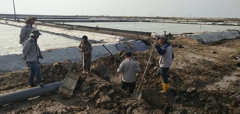 “一二三、起,注意塑布壞的地方要抓緊了”,在西灘組長沈秀成的帶領(lǐng)下,大家正在清理塑布積水,一場暴風(fēng)雨過后,灘面積聚了大量雨水,擋浪布也損壞較多,為了不影響下一步的人工扒鹽,大伙迅速做好災(zāi)后修復(fù)工作,保住生產(chǎn)成果,確保顆粒歸倉。