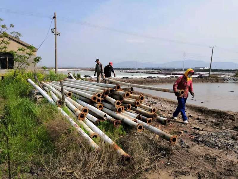 海濱工區(qū)一片繁忙景象,在凡平的統(tǒng)一指揮下,大家爭分奪秒的在往工具車上搬運(yùn)扒鹽管道和電纜,運(yùn)往先鋒西灘。先鋒西灘受臺風(fēng)影響,電線桿被刮到數(shù)根,等待供電所的修建得半個月,嚴(yán)重影響生產(chǎn)。海州灣公司在斷電的情況下,不等不靠想辦法,從海濱調(diào)度電纜,架設(shè)機(jī)泵,確保下一步人工扒鹽如期進(jìn)行。