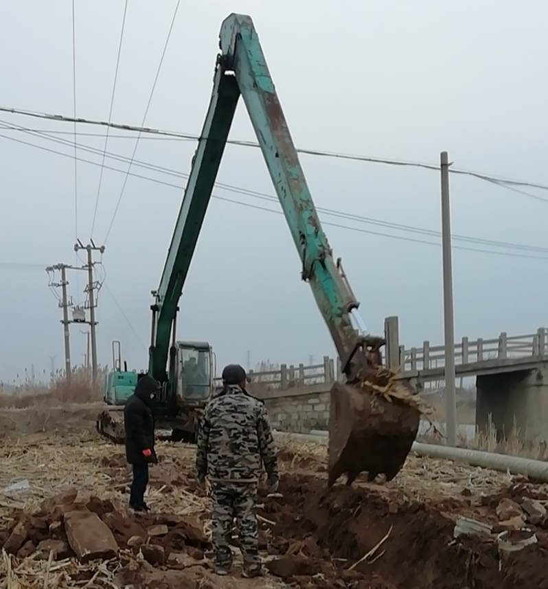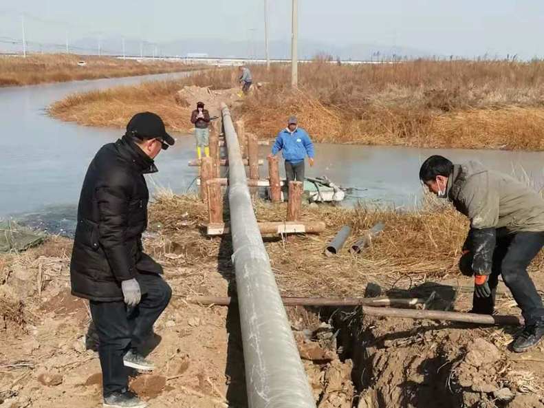 難!難!難!有困難才具有挑戰(zhàn),在“四拼”前一切困難皆為“紙老虎”,大家及時(shí)將壓力變?yōu)閯?dòng)力。確定方案后,立即分頭行動(dòng),一切工作按部就班,購(gòu)買(mǎi)8米木樁,河岸邊專(zhuān)人指揮長(zhǎng)臂挖掘機(jī)機(jī)械打樁,頭頂高壓線與通信線路相互交織,現(xiàn)場(chǎng)安全員全過(guò)程監(jiān)督指揮保障施工安全距離緊張施工,利用簡(jiǎn)易泡沫筏人工敲開(kāi)河面冰層,劃到河心鉆孔安裝木橫擔(dān),人工開(kāi)挖河對(duì)岸管道,切割吊取管道,打磨涂覆,一切都在有條不紊的進(jìn)行中。考慮到玻璃鋼管道的易碎性,不敢使用挖掘機(jī)吊裝,只能全人工小心翼翼的一小段一小段的輕抬慢放,慢慢挪到門(mén)型橫擔(dān)上緩緩過(guò)河,捆綁固定,最后是對(duì)口纏裹涂覆回填竣工。