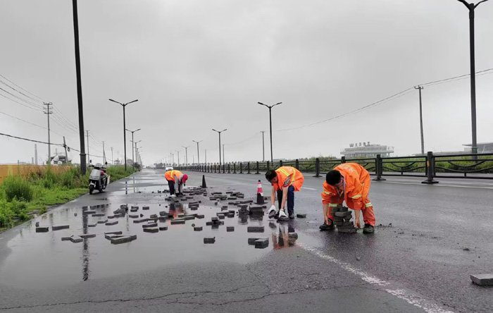 中午12時,保潔分公司接到徐圩城建應急處理電話,港前大道向南處近2000多米長路面存在大量拋灑磚塊,對過往車輛造成極大安全隱患,極易引發(fā)安全事故,嚴重影響行車安全。該分公司了解情況后,立即組織安排突擊隊員進行及時清理。現(xiàn)場,3名身著橘紅工作服的養(yǎng)護人員首先擺放了安全警示錐,隨后徒手進行拋灑物的撿拾工作。經(jīng)過3個多小時的努力,累計搬運磚塊近800多塊及時消除了安全隱患該路段又恢復了往日的干凈整潔,車輛通行安全暢通。(楊波)